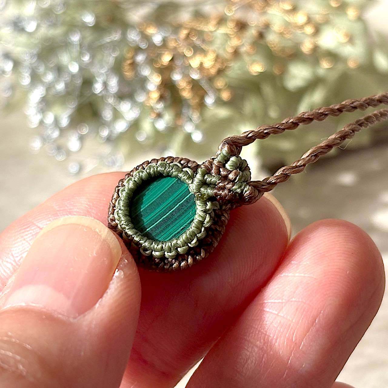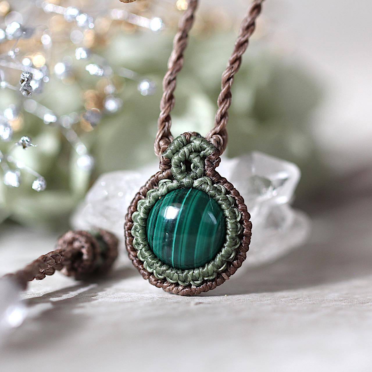 小さなカボッションのマラカイトをシンプルに編み包んだペンダント。