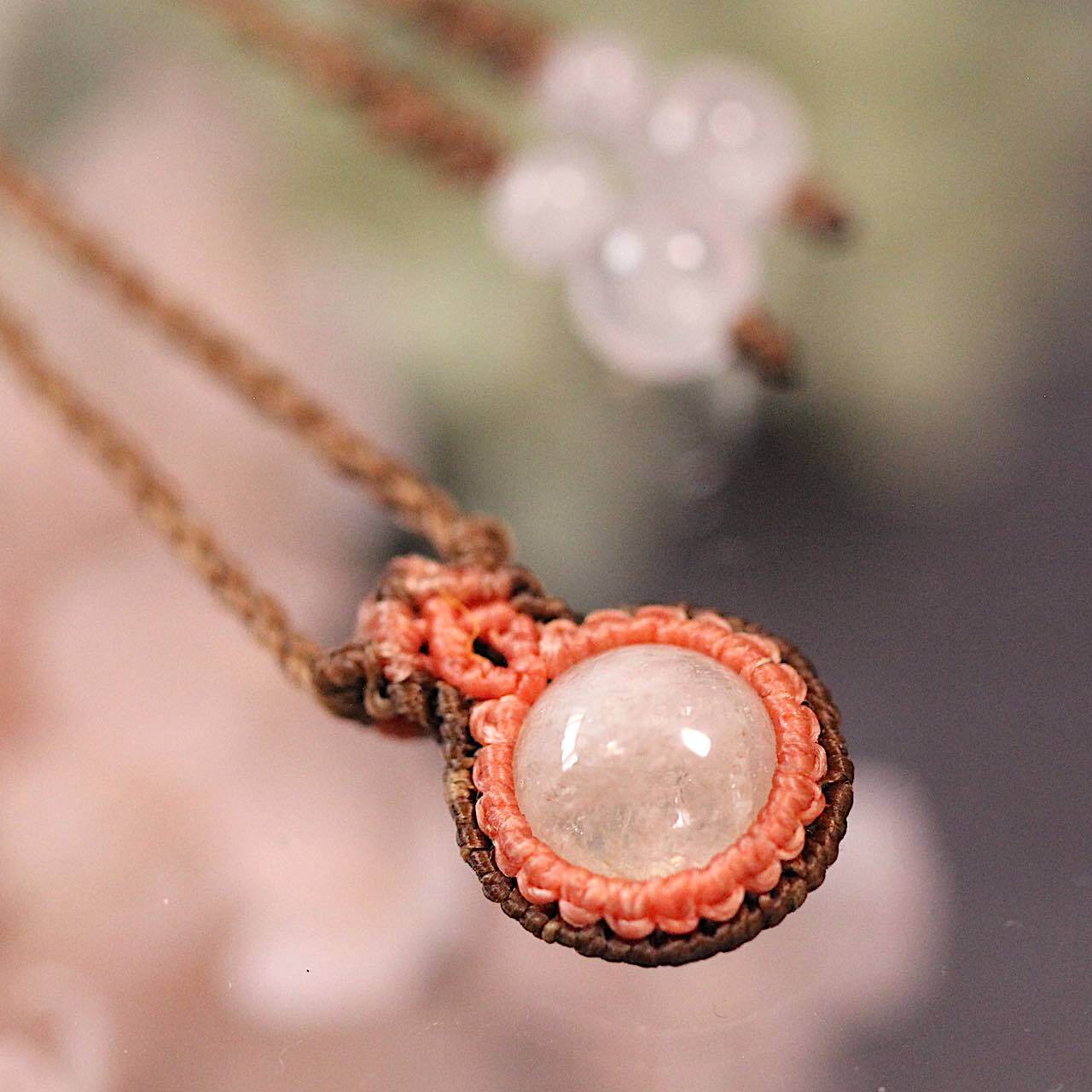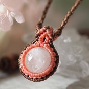 小さなカボッションのモルガナイトをシンプルに編み包んだペンダント。