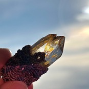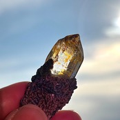 表面にリモナイトが付着して黄金色に輝くゴールデンヒーラーと呼ばれる希少な水晶で、先端にはセルフヒールドが見られます。