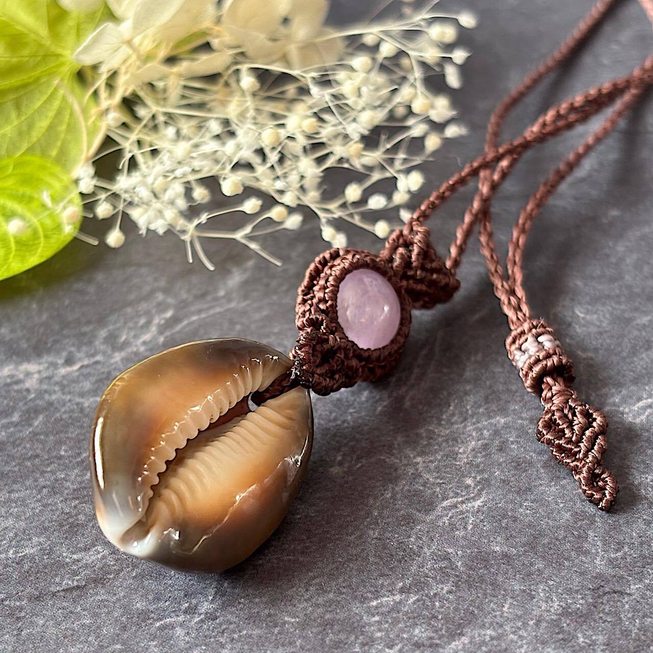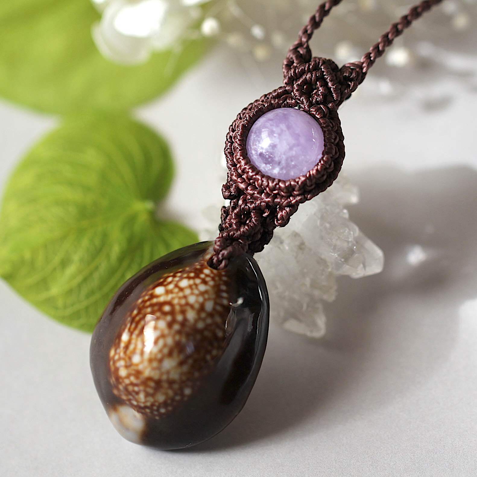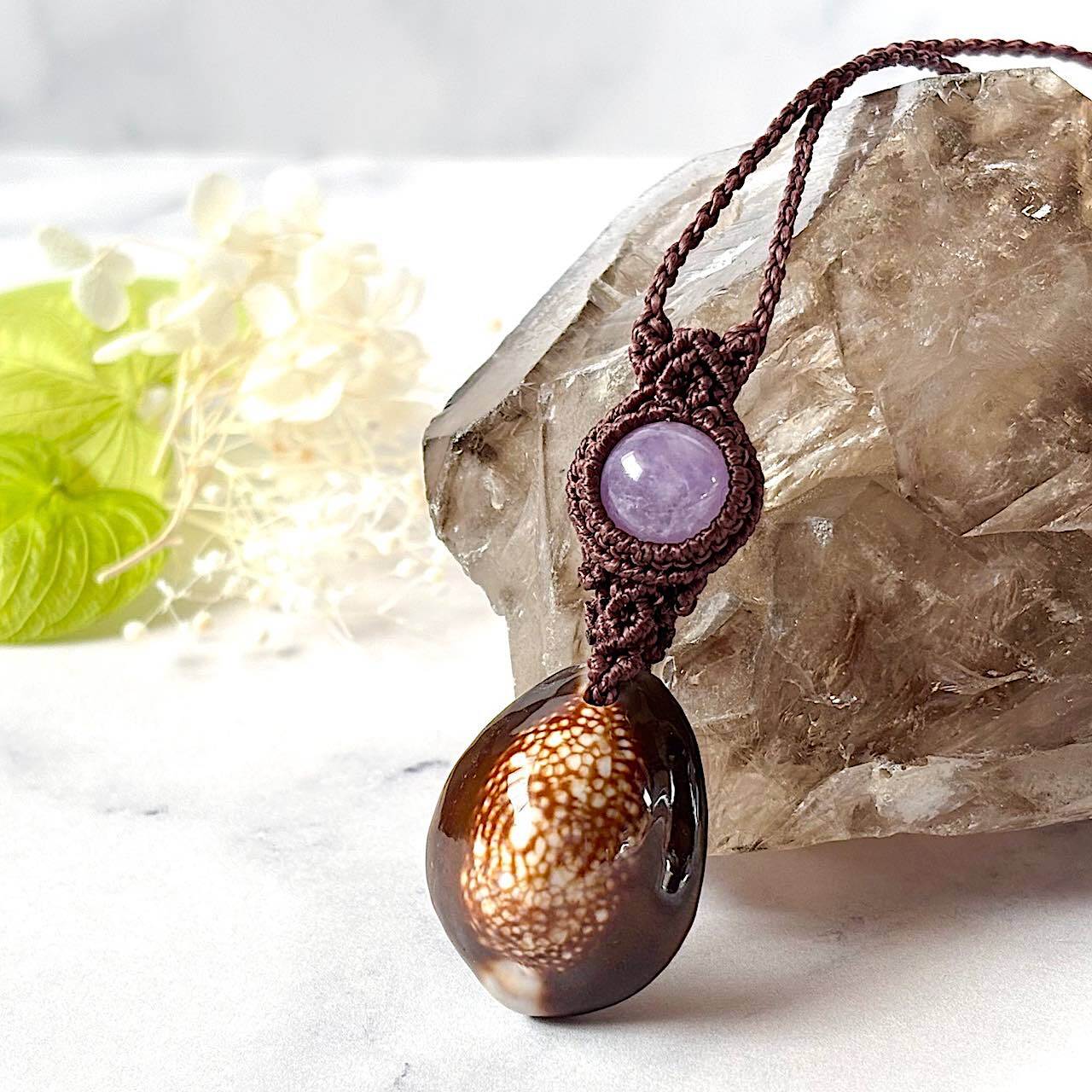 豊穣の器である宝貝と天然石のラベンダーアメジストを組み合わせたお守りペンダント。